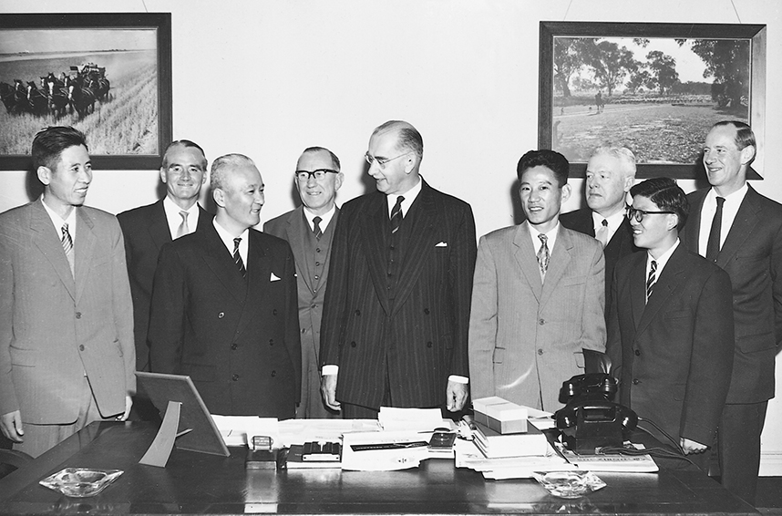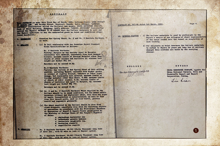 1960年下半年,华润公司的刘朝晋以“刘良”名义与加拿大签订了第一份进口小麦合同,从此拉开了中国大量进口粮食的序幕。图为1961年,刘朝晋化名“刘良”代表710公海线路检测 - 欢迎来到公海710与加拿大签订进口小麦合同。